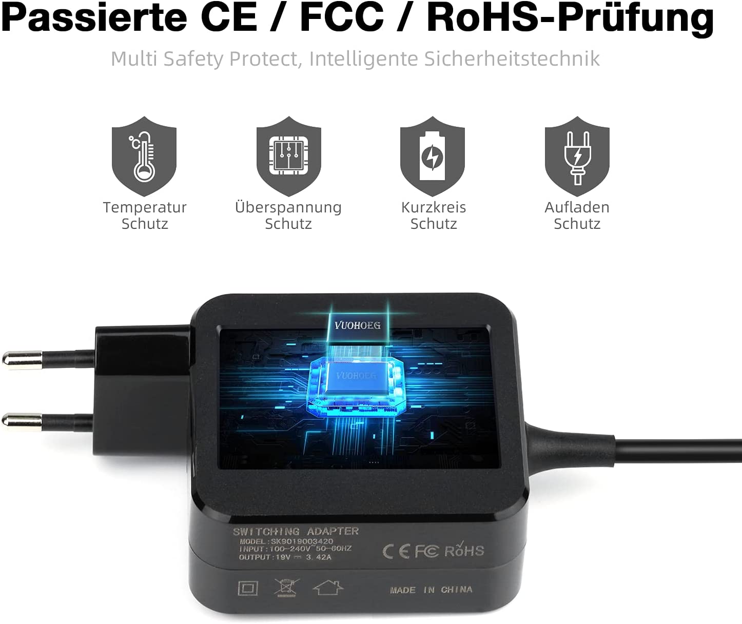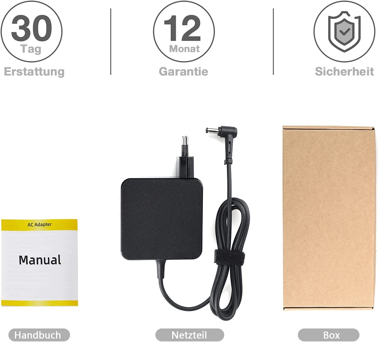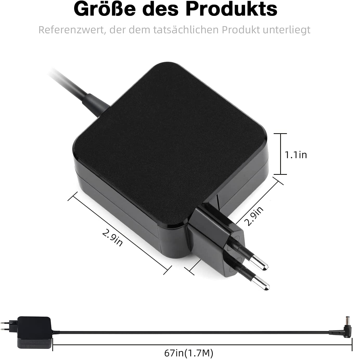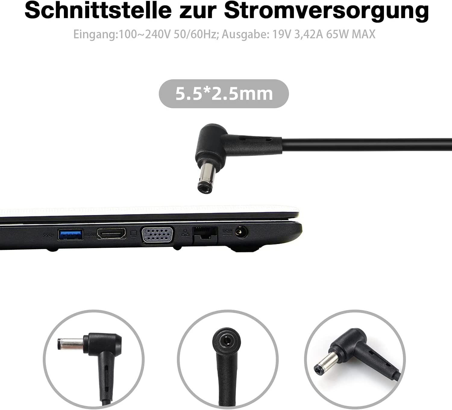 - Specification: Input: 100~240V 50/60Hz; Output: 19V 3.42A 65W MAX (compatible with 19V 1.75A 33W and 19V 2.37A 45W); Connection size: 5.5mm x 2.5mm; The high-quality internal chip can increase the charging efficiency to over 50%. Package contents: 1 x Asus charger, 1 x power cable, 1 x user manual (English language not guaranteed).