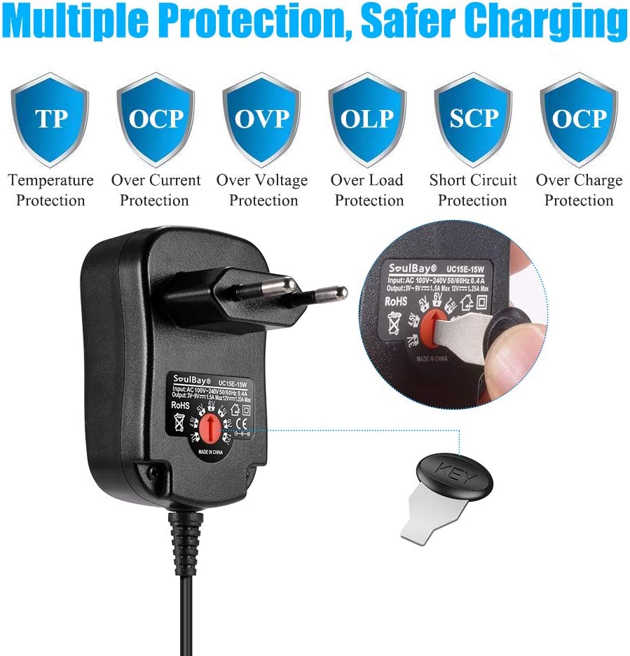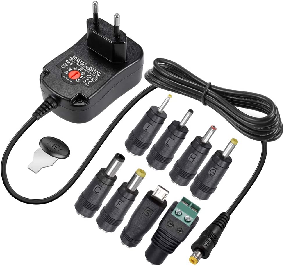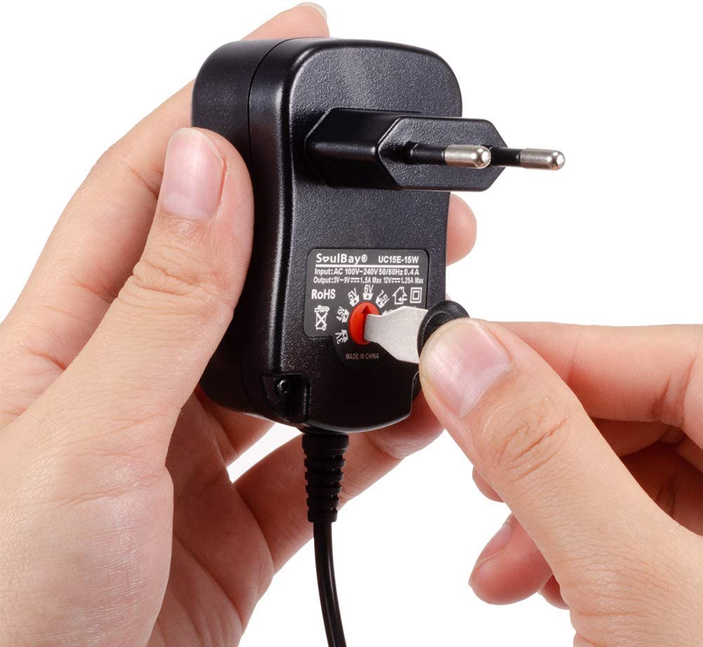 - ✔️ AC input: 100-240 V 50/60 Hz, DC output: 3 V / 4.5 V / 5 V / 6 V / 7.5 V / 9 V 1500 mA, 12 V 1250 mA max. Polarity:Center Positive You can easily adjust the voltage via a small key included in the package.