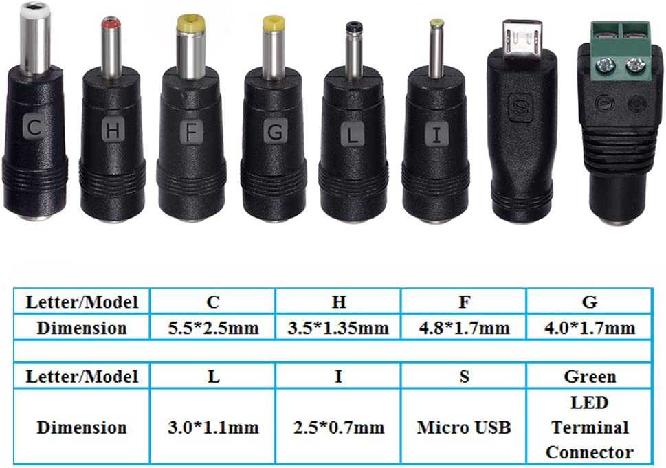 - ✔️ 8-in-1 DC adapter – comes with 8 adapter plugs, the different size will fit your devices well and solve your various problems. You can largely store your space and it can replace many chargers. Note: If there are any problems with the product quality, please contact us at any time and we will help you!