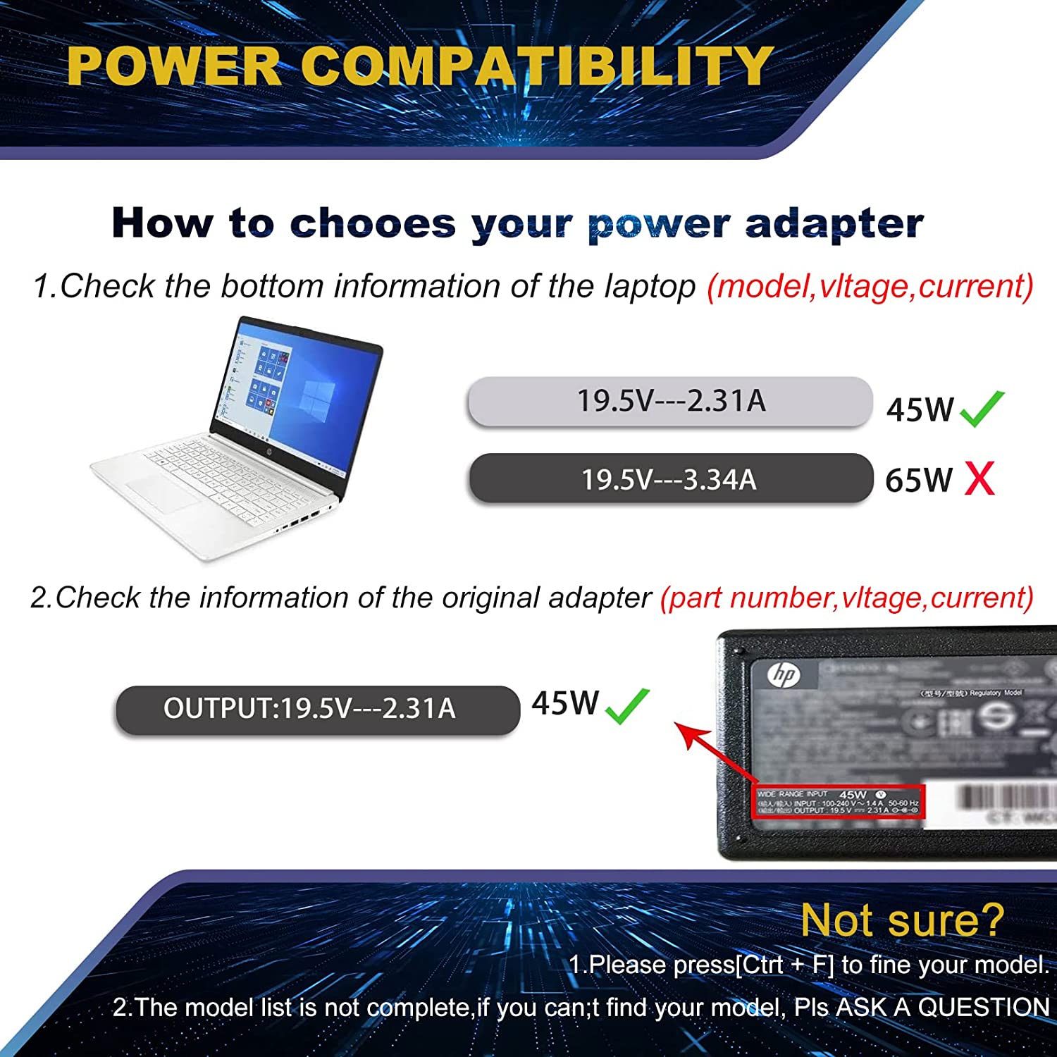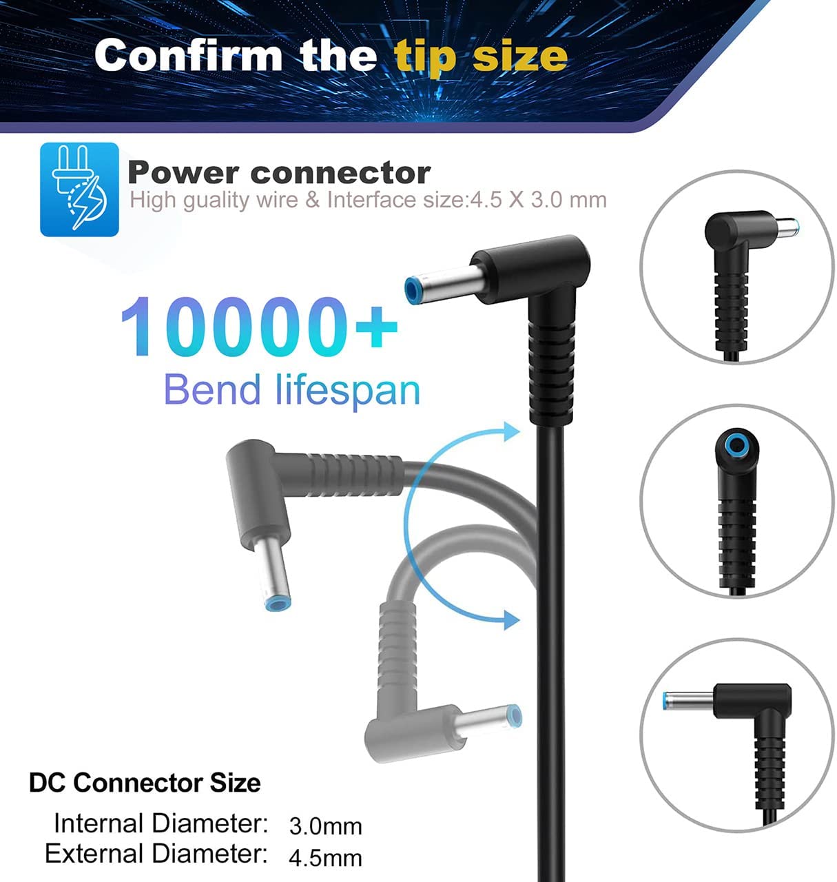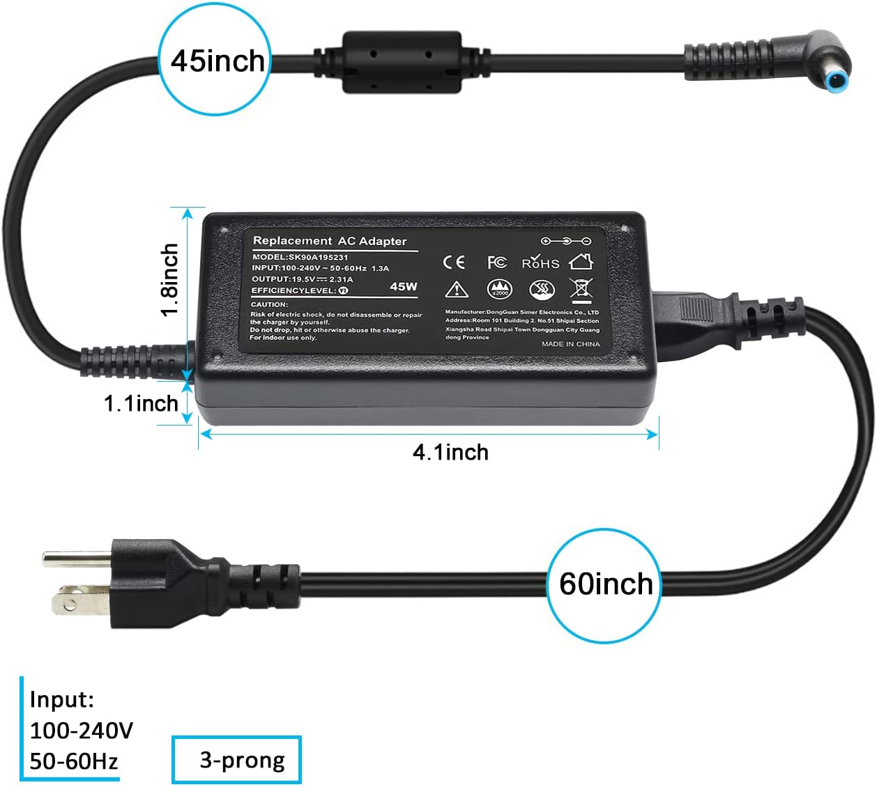 - Input : AC 100-240V 1.3A 50/60 Hz (Worldwide AC Input), Output : DC 19.5V 2.31A 45W; DC Connecter size:Internal Diameter: 3.0mm,External Diameter: 4.5mm Blue Connector power supply adapter.