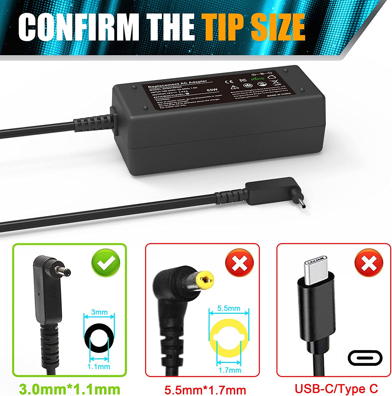 - Output: 19V ~ 3.42A ~ 65W , Input: 100~240V / 50~60Hz Connector: 3.0mm * 1.1mm (Be Carefully!!!Check Connector Picture)