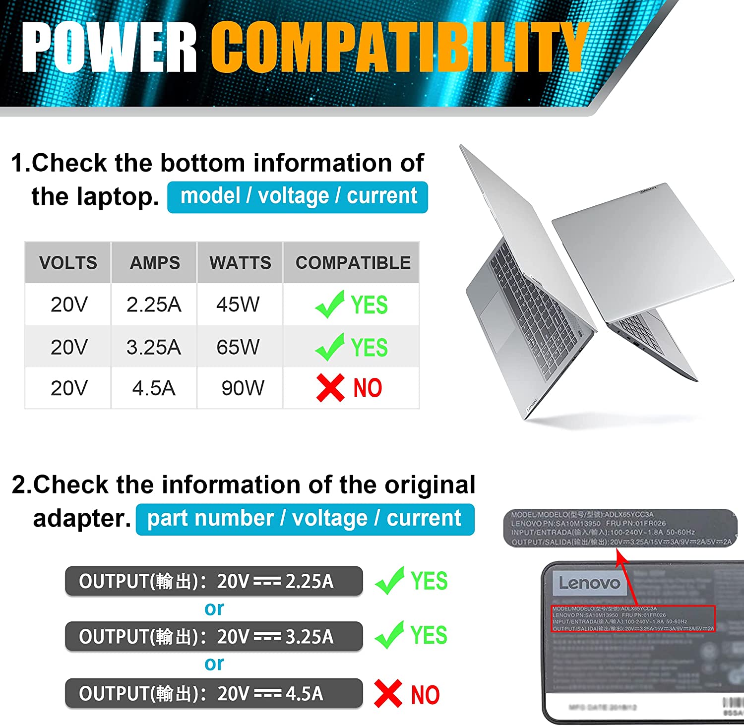 - Output: 20V~3.25A~65W Input: 100~240V~1.5A 50/60Hz,Connector: yellowe USB tipAlso compatible with 45W