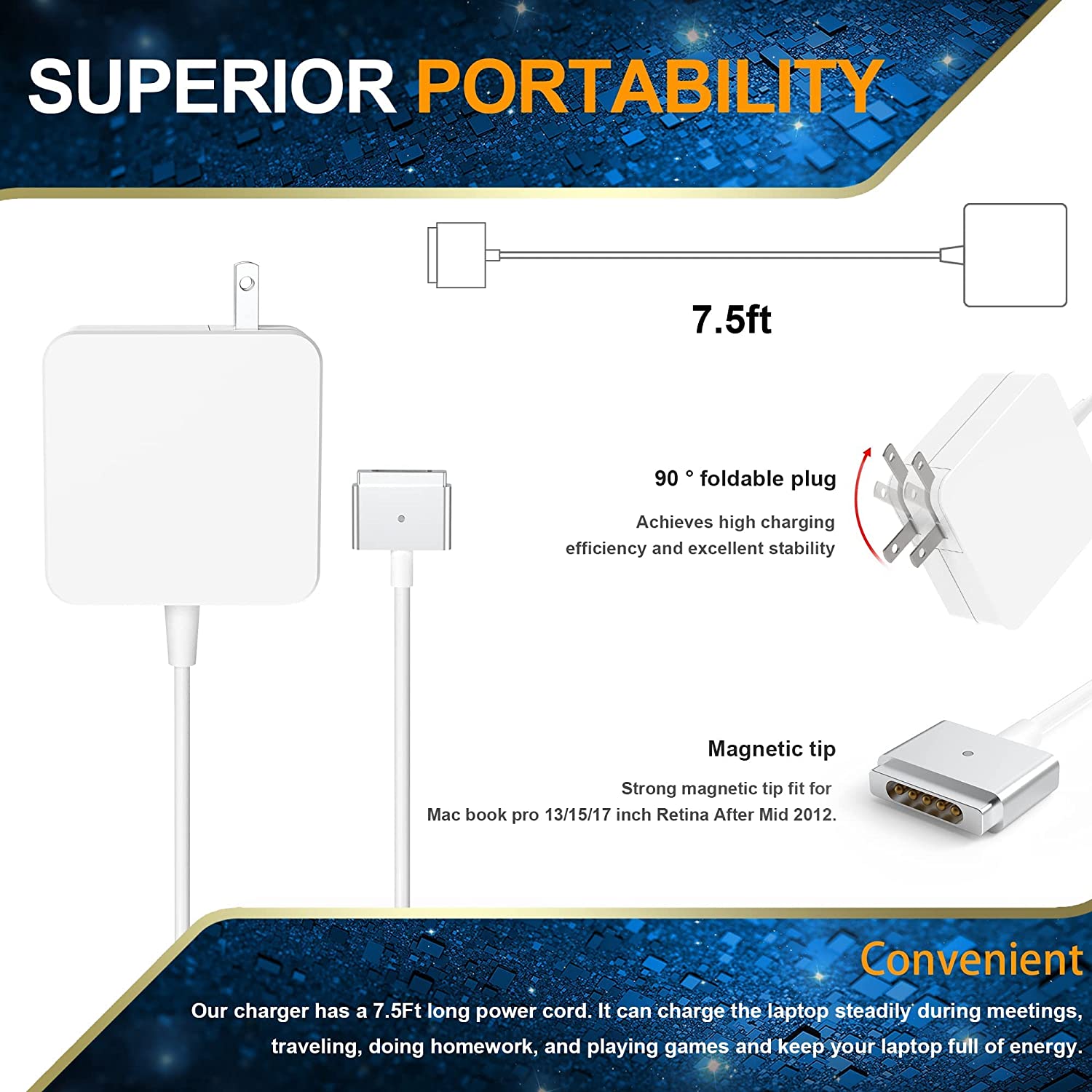 - ① Wide Compatibility: 85W (T) -Tip Magnetic power adapter for macbook Pro 13 in,15 in and 17 in: A1278,A1502,A1344,A1465,A1502,A1425,A1435,A1466,A1398,A1424,ME293, ME294, ME664, ME665, MC975, MC976, MD506, MJLU2, MJLT2, MGXC2, MGXA2. Compatible with Mac Book Air 45/60/85W with T Tip as below (11-inch, 13inch, Mid 2012,Mid 2013,Early 2014, Early 2015).Please check your laptop model carefully before buying.