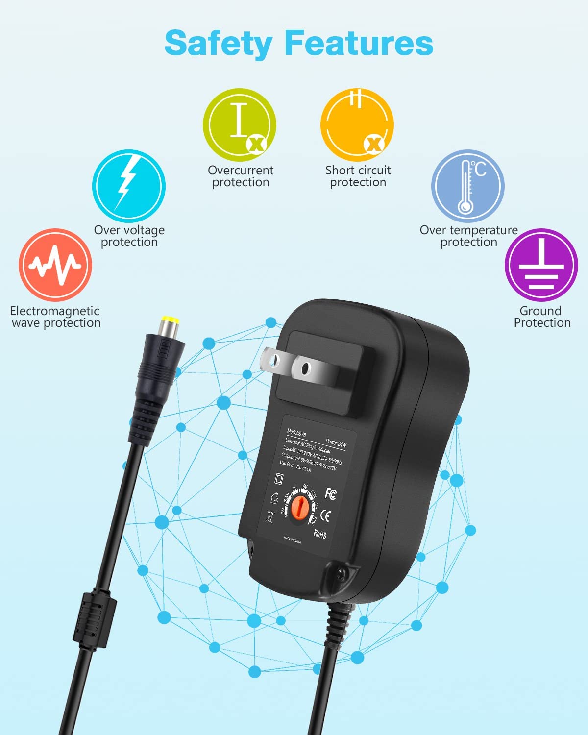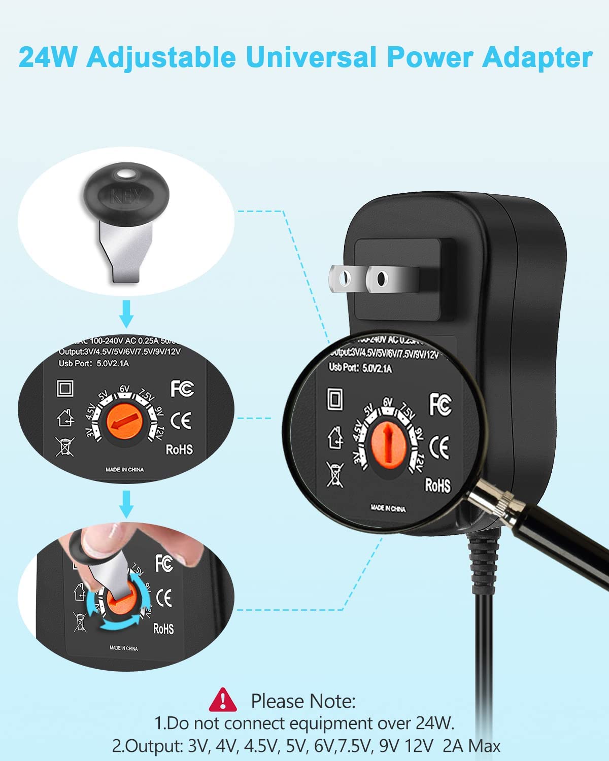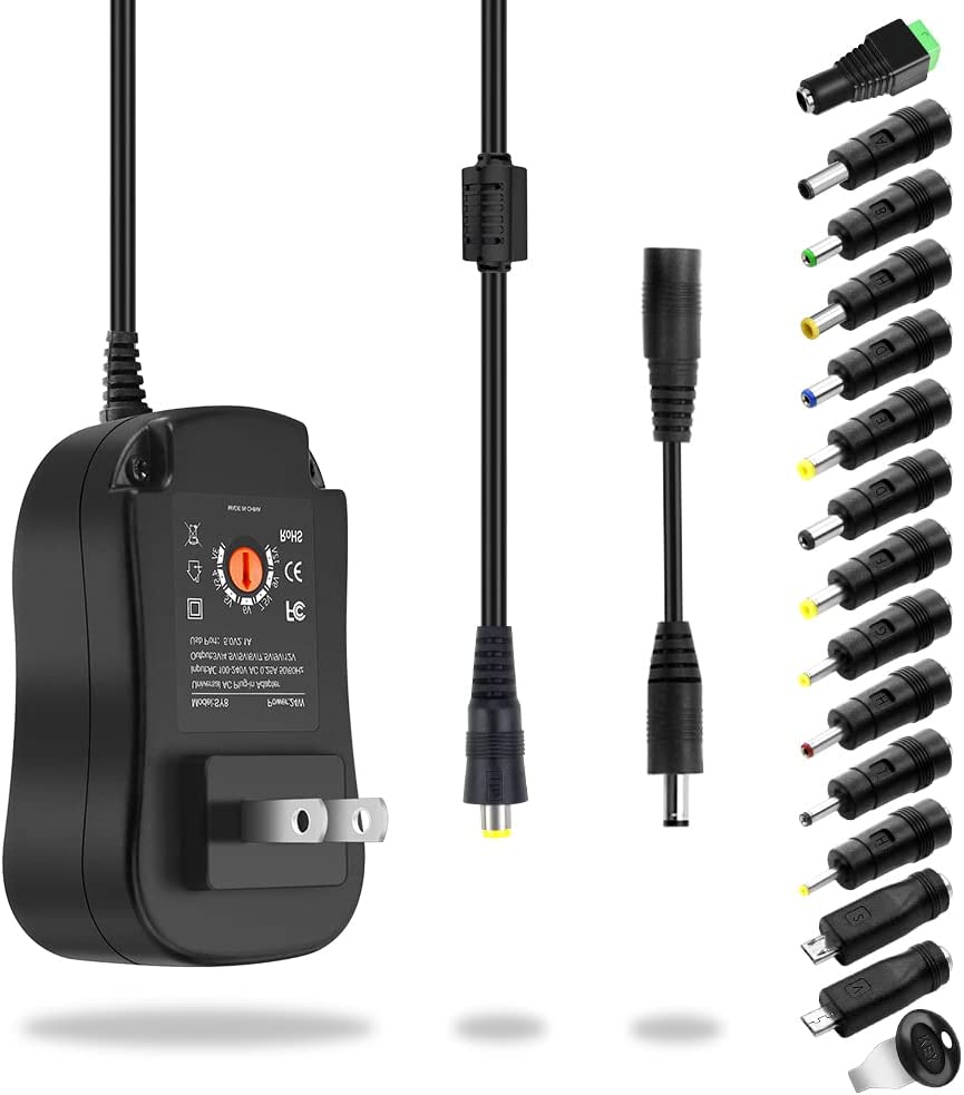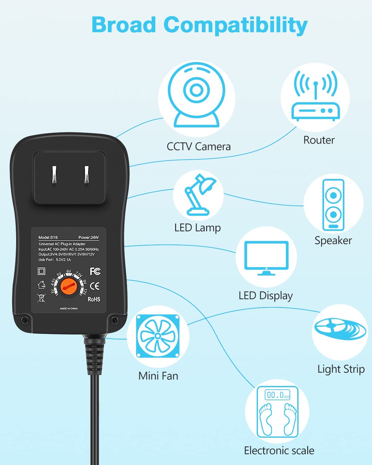 - 24W Multifunctional Adapter: 24W 3V-12V universal power supply is equipped with 14 interchangeable plugs, suitable for 90% AC/DC household appliances, such as 3V to 12V household appliances, audio amplifier, wireless router, surveillance camera, car air purifier, 3D printer, water pumps, electric drills, electric fans, electric fans, motors, Android TV Box, ADSL Cat, 5V 12V LED strips Lights.