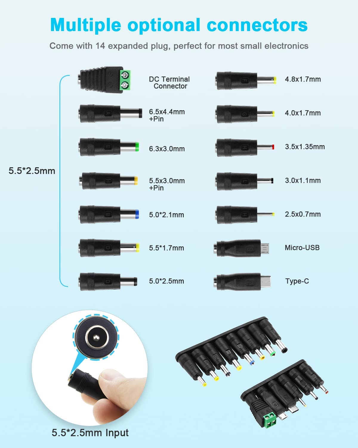 - AC/DC Universal Charger: It comes with an original 5.5×2.5mm tip and equipped with 14 adapter plugs, 5.5×2.1mm, 5.5×1.7mm, 5.0X2.5mm, 5.5×3.0mm+Pin, 6.5X4.4mm+Pin, 6.3×3.0mm, 4.0X1.7mm, 4.8×1.7mm, 3.5X1.35mm, 3.0×1.1mm, 2.5X0.7mm, DC terminal connector, Micro-USB, Type-C. The different size tips fit for various electric appliances well. We specially added a reverse polarity converter cable, for electronic devices that needs center output negative power supply.