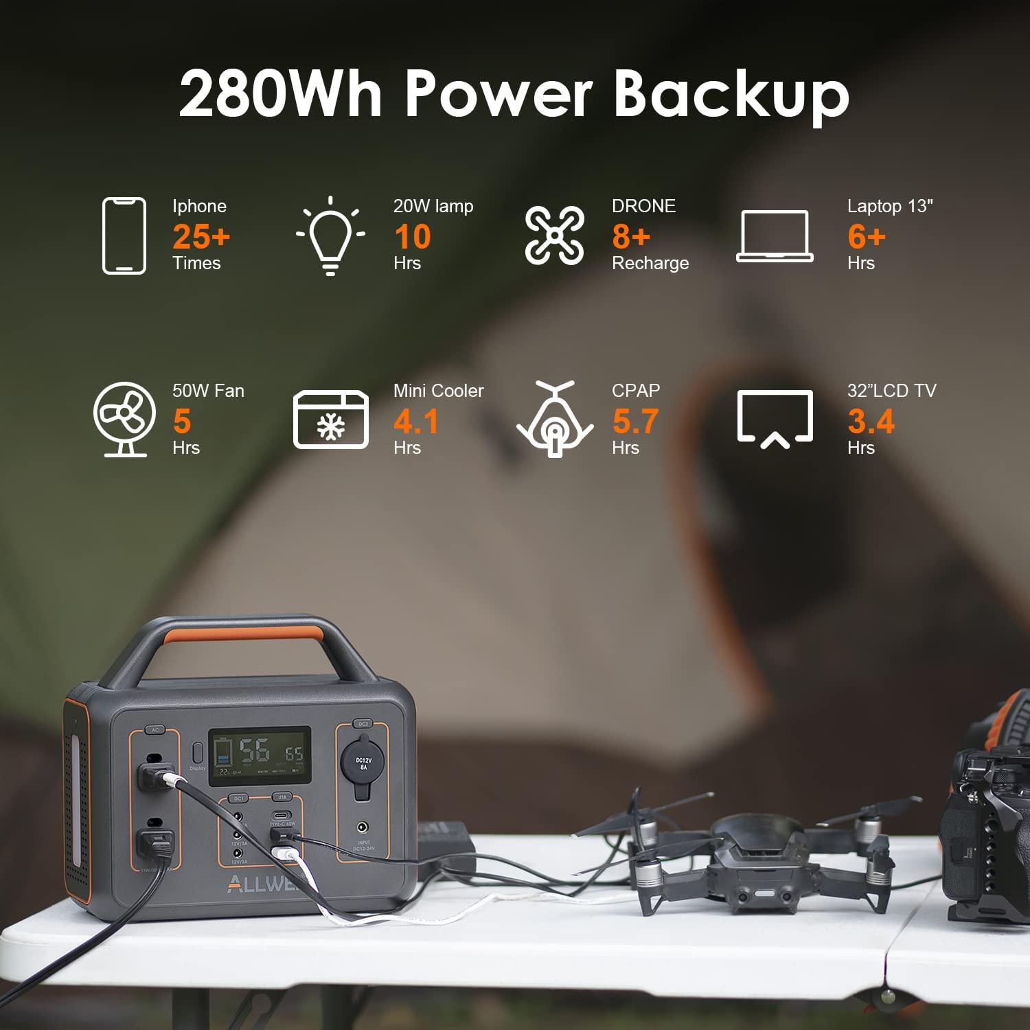 ALLWEI Portable Power Station, 280Wh Backup Lithium Battery, Regulated DC for mini Cooler, USB-C PD60W, 300W Pure Sine Wave AC Outlet Solar Power Generator for Outdoors Camping Travel Emergency