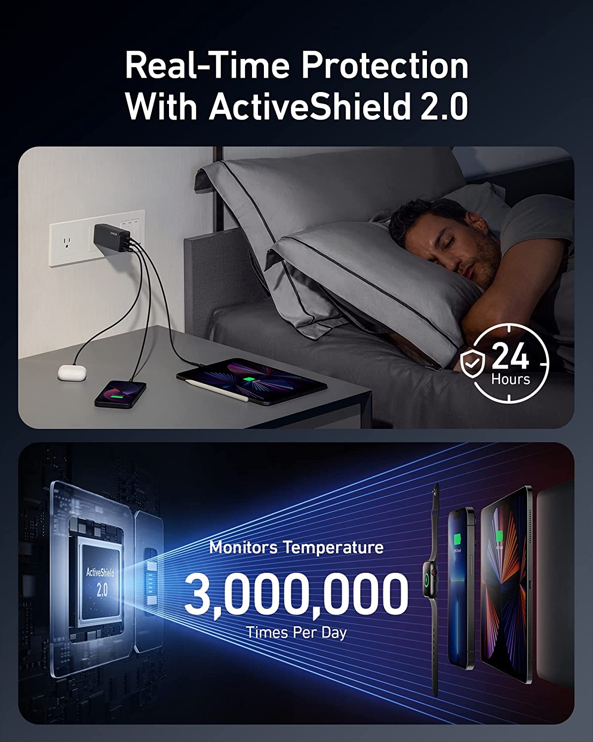 - ActiveShield 2.0: Anker’s proprietary technology enhances protection by intelligently monitoring temperature over 3 million times per day and adjusting power output to safeguard your connected devices.