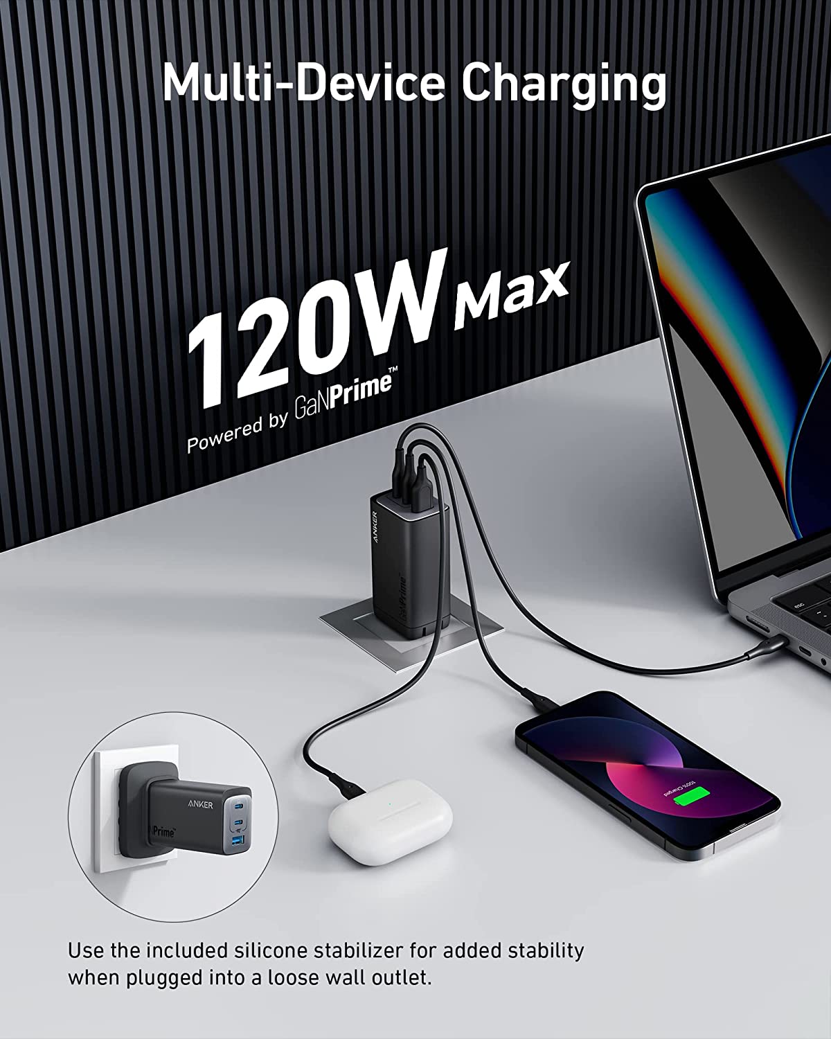 - What You Get: Anker 737 Charger (GaNPrime 120W), silicone stabilizer, welcome guide, our worry-free 24-month warranty, and friendly customer service.