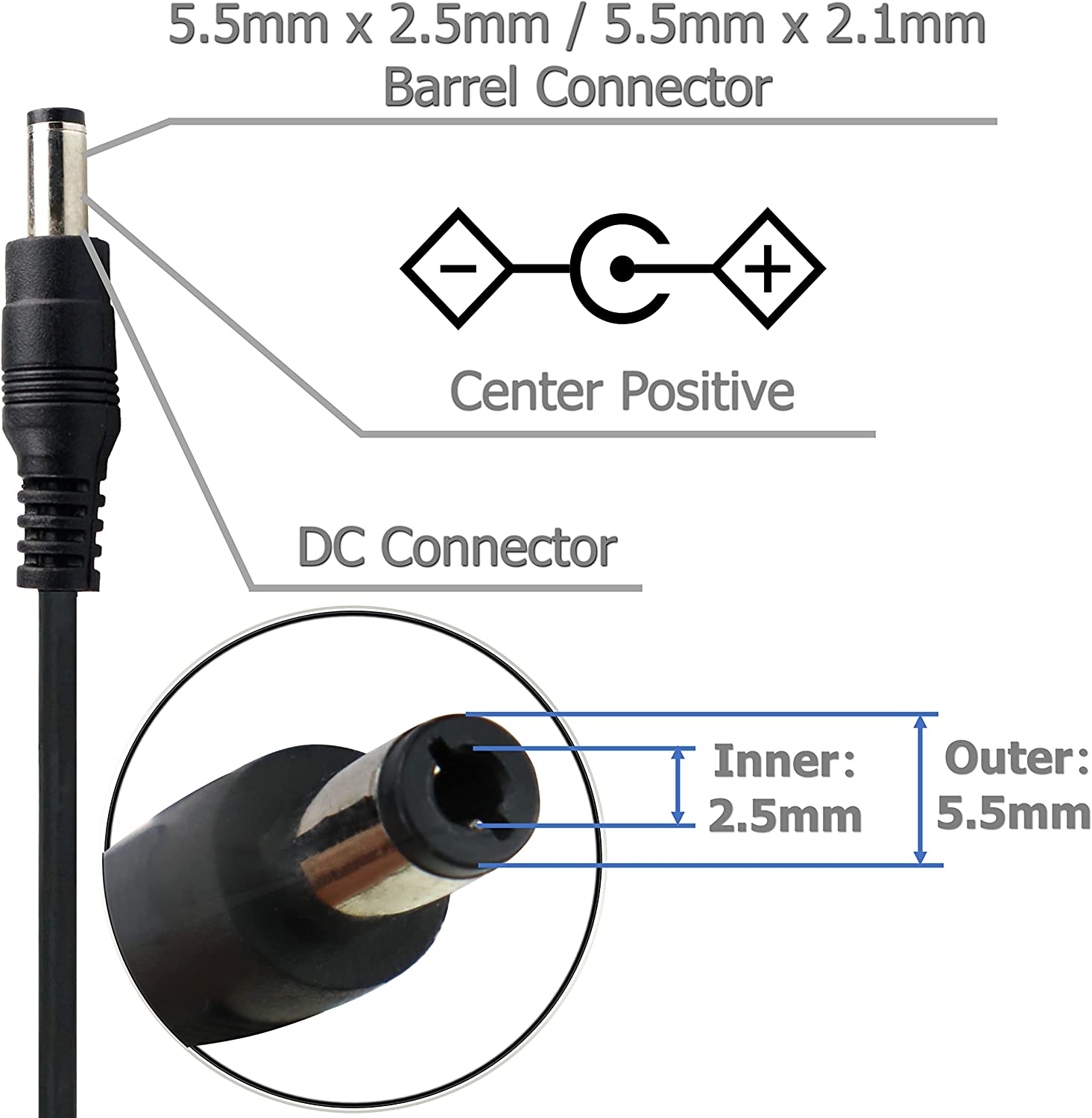 - Connector Size : fits for both 5.5mm x 2.5mm and 5.5mm x 2.1mm plug ,Wire Length:Approx. 3.3ft / 100cm