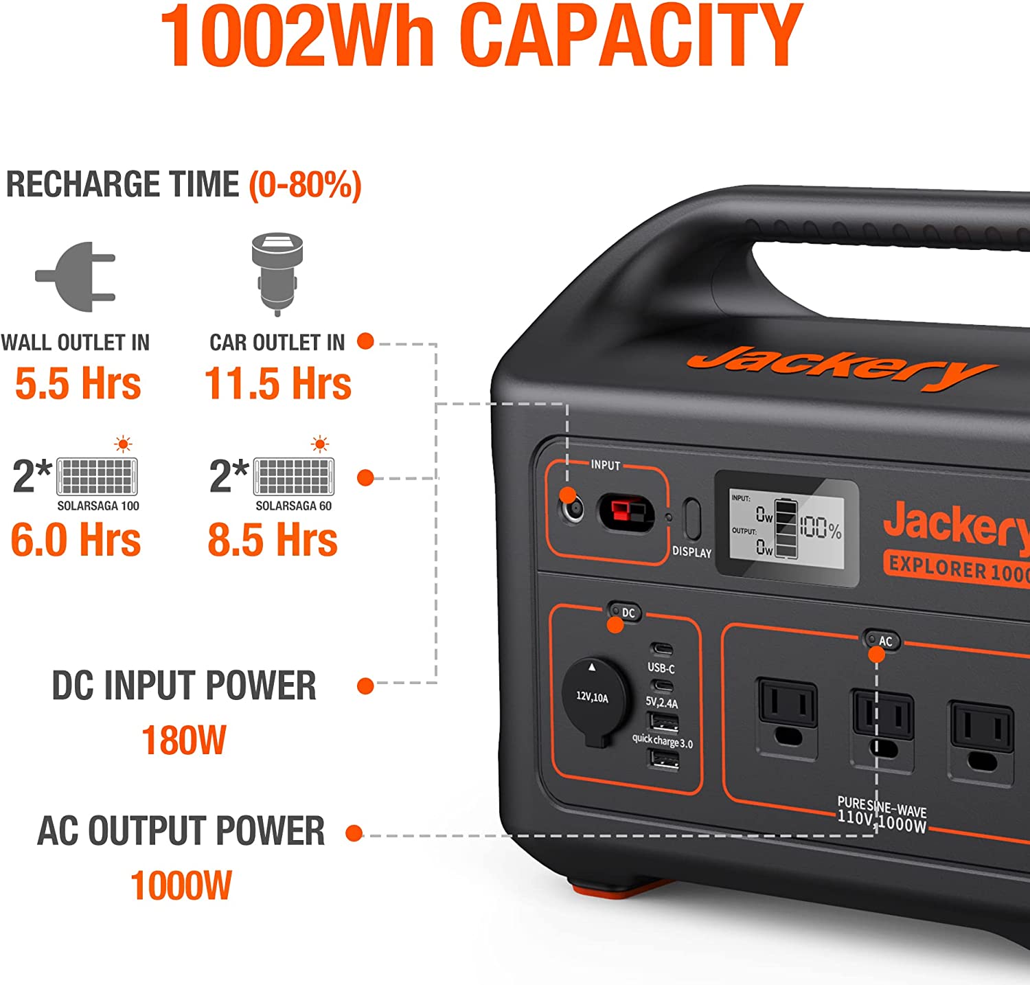 - WHAT YOU GET: 1* Jackery Explorer 1000 Portable Power Station (1002Wh Portable Power Station), 1*AC Adapter, 1* Car Charger Cable, 1*SolarSaga Parallel Adapter Cable, 1* User Manual.