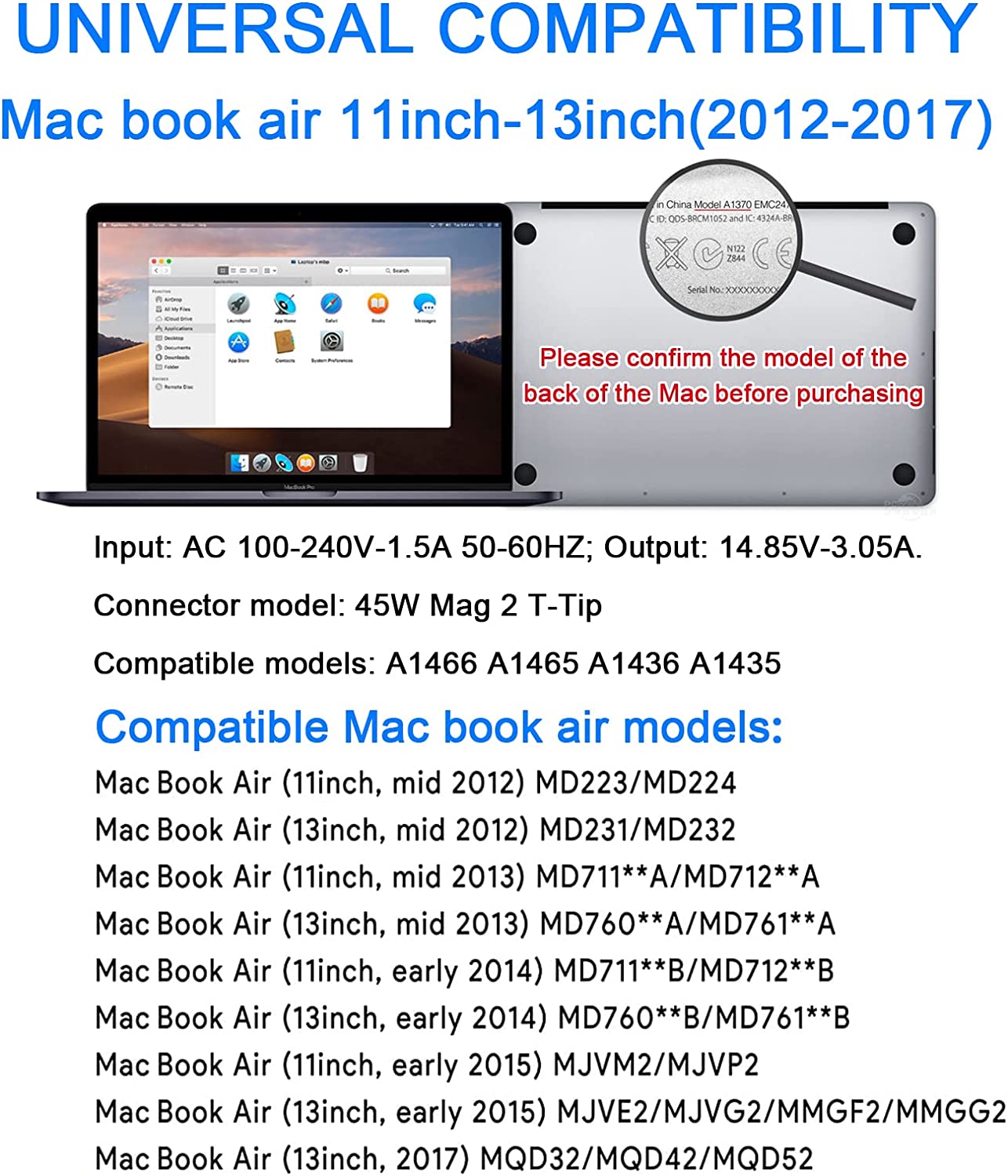 - Input: AC 100-240V 50-60Hz, Output: 14. 85V 3. 05a 45W. Knowing what specific Mac model you have is important. Please check out carefully before purchasing.