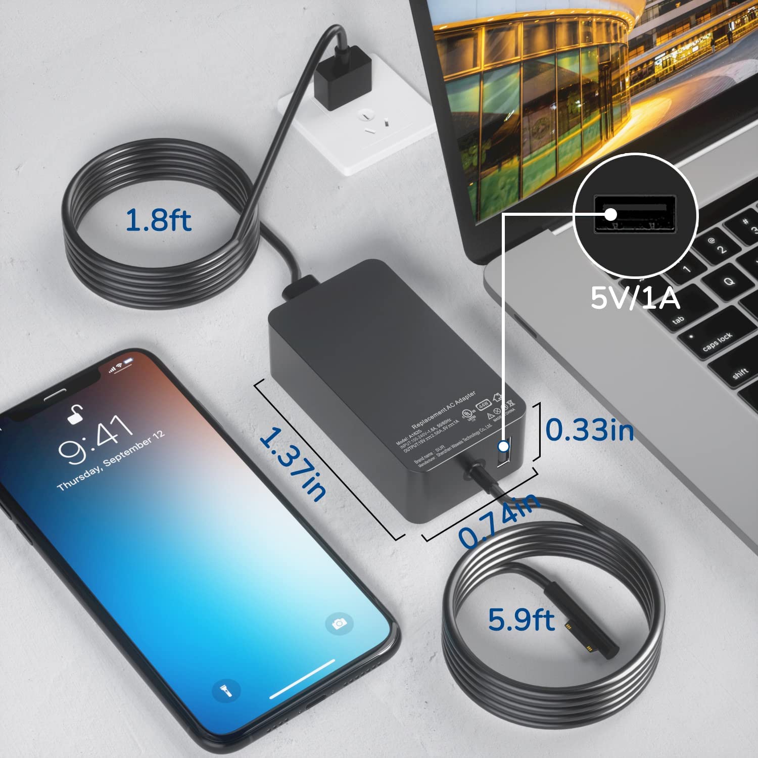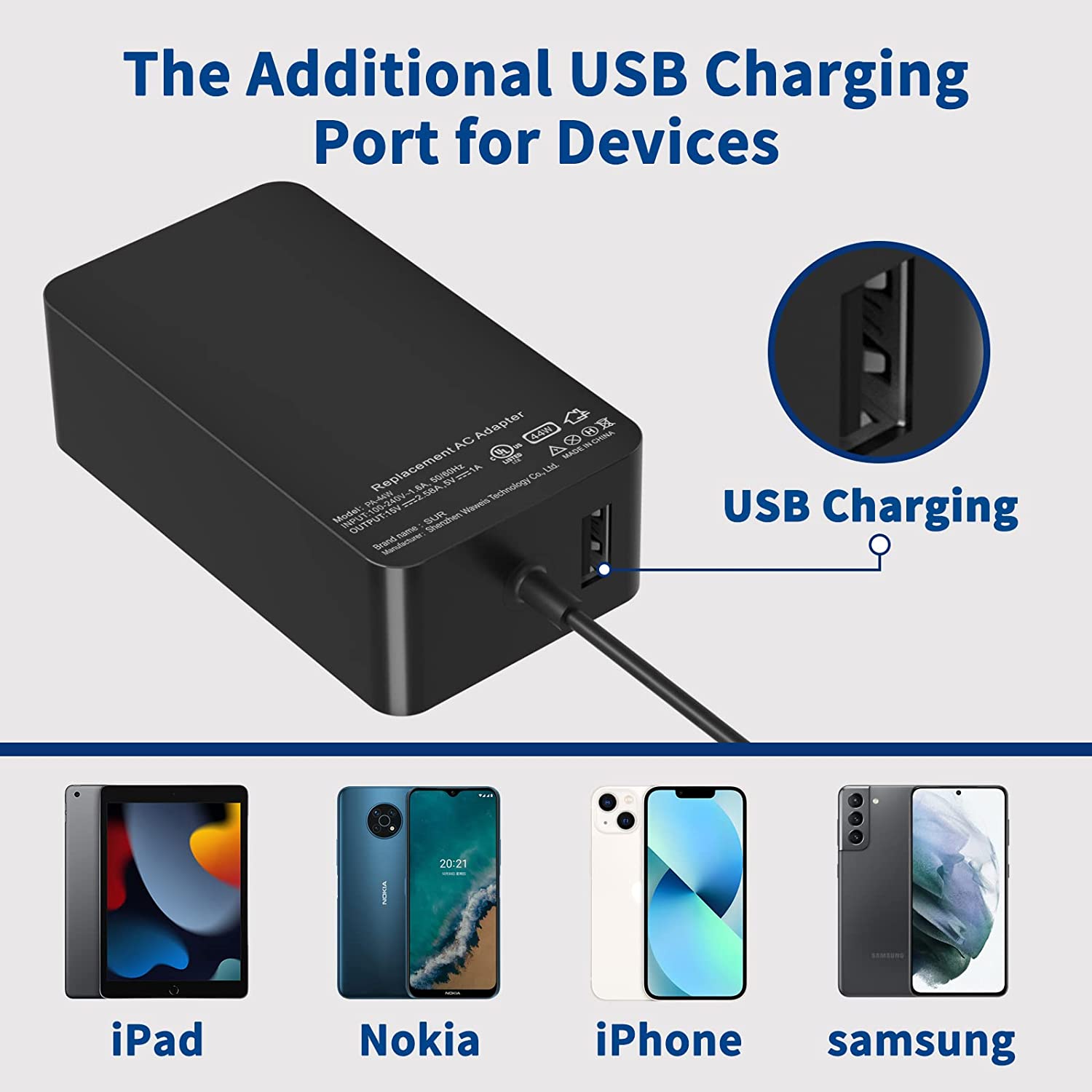 - Input&Output: Power Input: 100-240V~1.6A, 50/60Hz(universal); Power Output:15V-2.58A, 44w;With 5V/1A additional USB 2.0 charging port which allows you to charge another device such as your phone or iPad at the same time.This surface Charger also supports the power of output 12V-2.58A 36W and 15V-1.6A 24W.