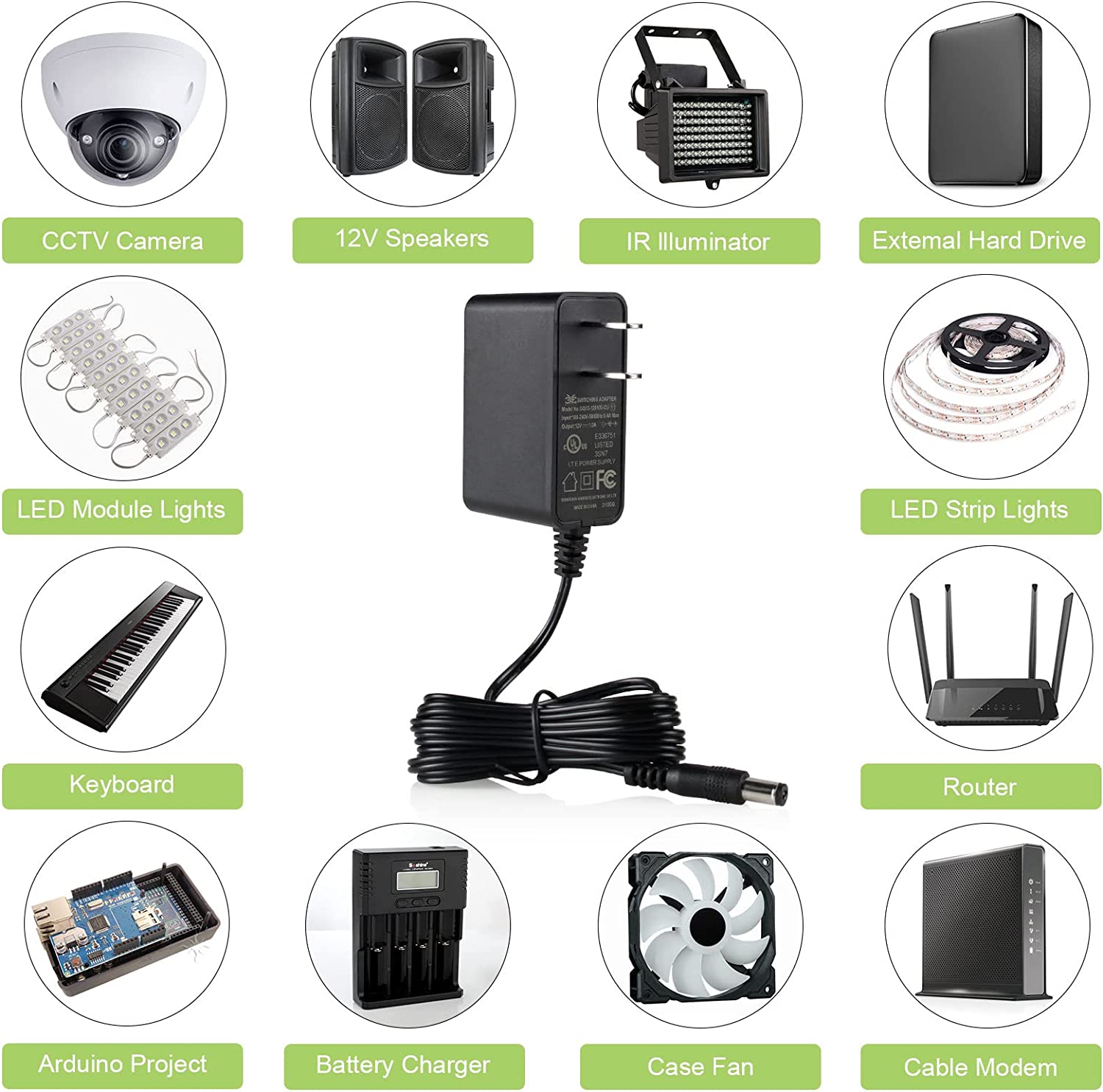 - It is perfect for 12V devices less than 12W, such as LED light strip, CCTV camera security system, Bluetooth speaker, keyboard, TV boxes, webcam router,etc.