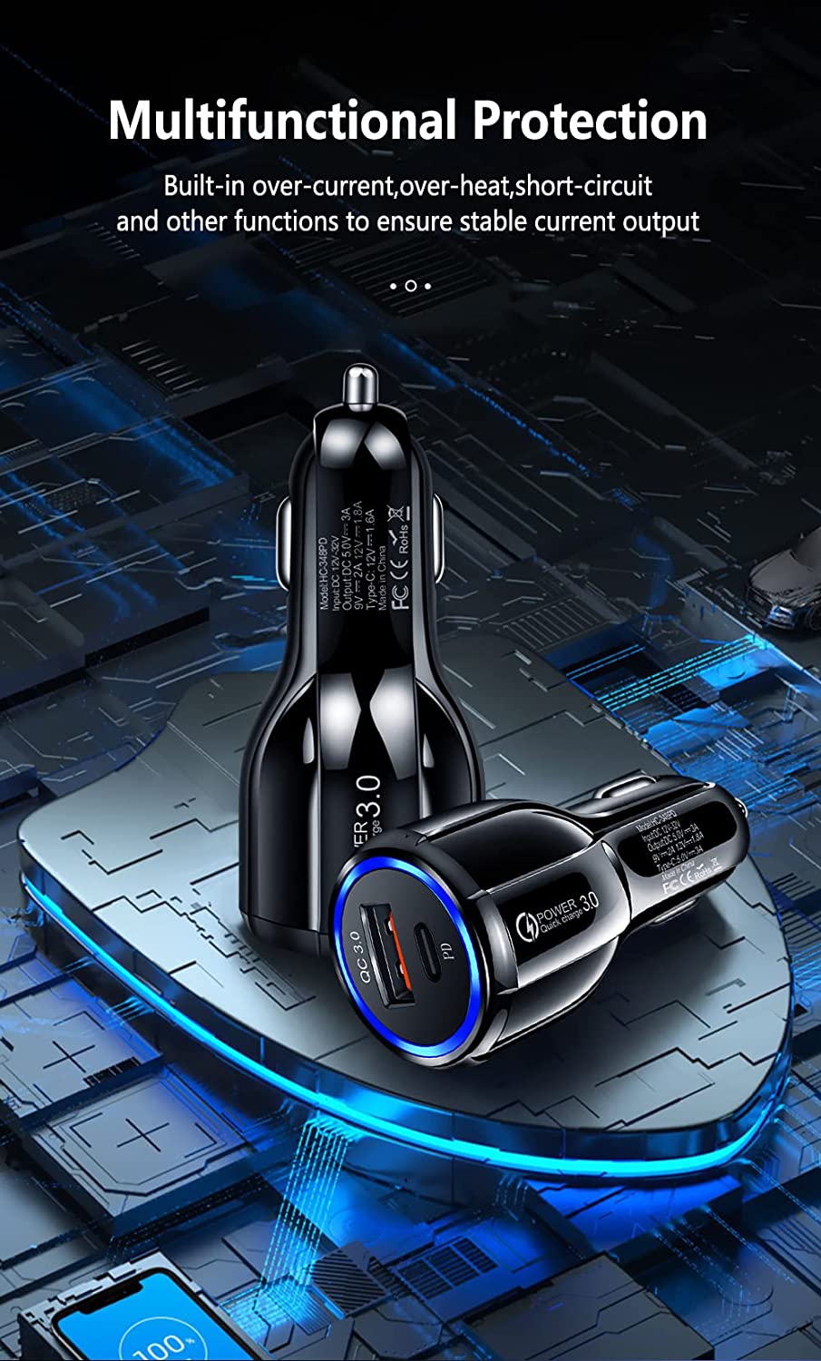 • ✅⚡OFFICIALLY APPROVED PD3.0 + QC3.0, AIM FOR FASTER & SAFER: This car charger has been recognized by official USB-IF and Qualcomm and passed 15 multi-layer tests, so charging efficiency has increased by 80% and charging stability rate increased by 93% and the using durability increased by 200% so you can charge faster and safer. Promise you, offering whole Life Charging.