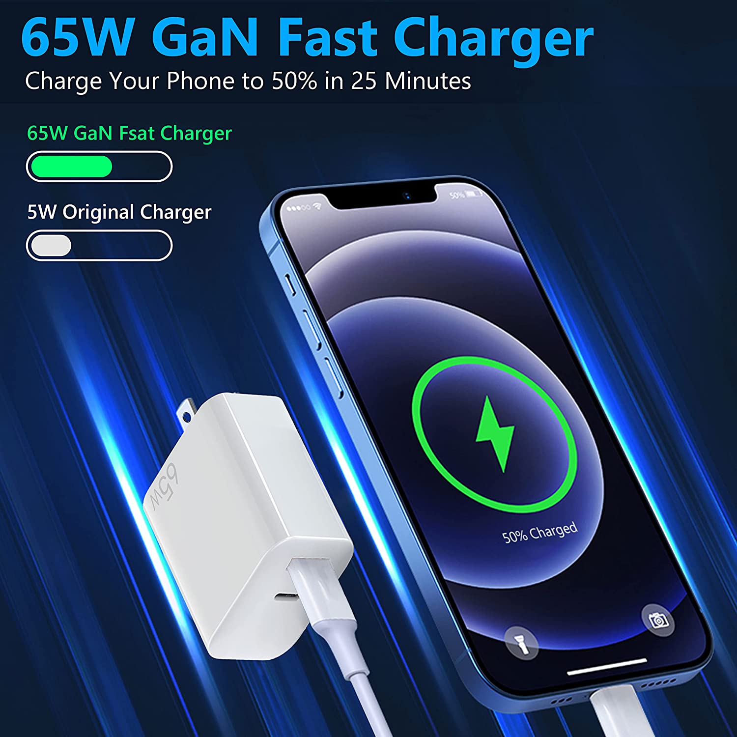 - 65W GaN Fast Charger: The power adapter uses advanced GaN technology, which enables you to charge your smartphone or tablet devices simultaneously at a fast and safe.The GaN fast charger your phone up to 50% in 25 minutes.Compared with ordinary fast charging, it does not heat up when charging.